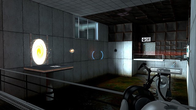 From what I can tell from this image is that it uses lighting to show important objects in the game level, the brighter it is the more meaning it usually has, for example the portals are bright coloured and so are the laser trackers to show the player were things are. It also has colour co ordination as the white walls you can put portals on while the darker walls you can not. The game layout in portal is designed to challenge the player to make them think were to go as they use the map layout to make it complex to give the player a puzzle to solve.